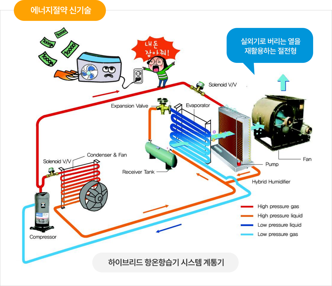 이때 실외기에서 아까운 열에너지가 버려지게 되는데, 이 에너지를 재활용하여 별도의 에너지 공급없이 물을 증발시켜 습도조절 및 공기를 가열하여 항상 일정한 온.습도를 유지할 수 있게 만든 신기술의 제품을 하이브리드 항온항습기라고 합니다.